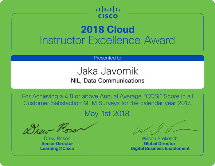 Jaka Javornik je prejel priznanje Cisco Instructor Excellence Award za izvajanje tečajev s področja računalništva v oblaku, Robert Lesar pa za poučevanje zahtevnih izobraževanj Cisco CCIE Routing & Switching.